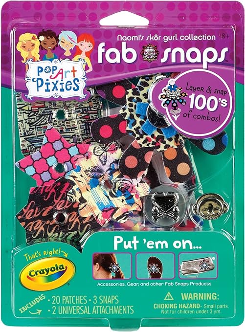 Crayola Pop Art Pixies Fab Snaps. Crayola Pop Art Pixies Fab Snaps Starter Refill Kit gives you even more ways to express yourself with Fab Snap ready products. The univeral attachment lets you customize almost any accessory into a new degisgn.
